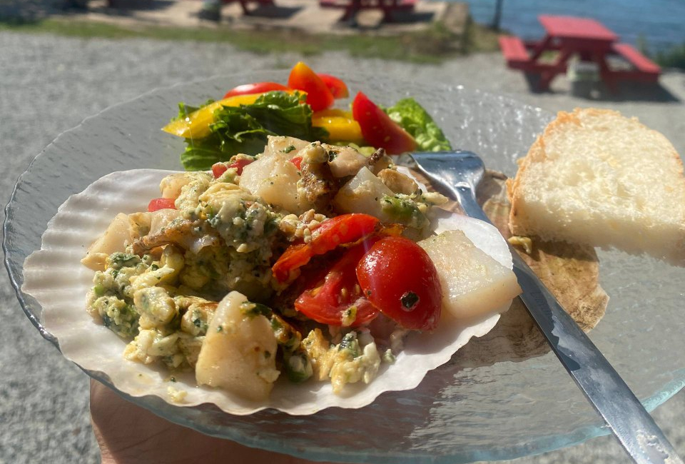 Филе живого гребешка, обжаренное на оливковом масле с яйцом, сливками и томатами черри, подается с хлебцем;
