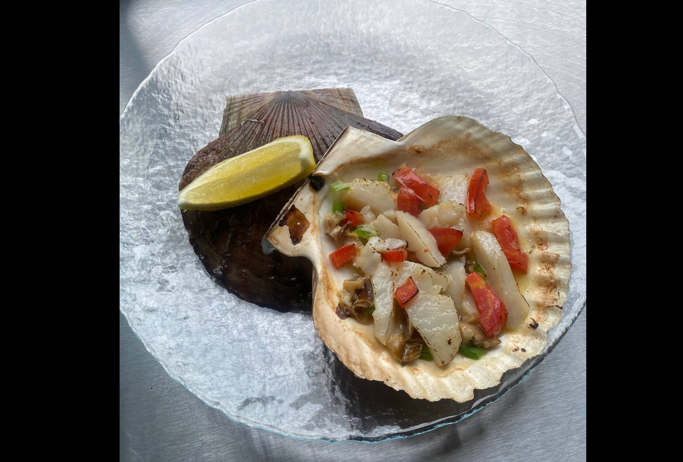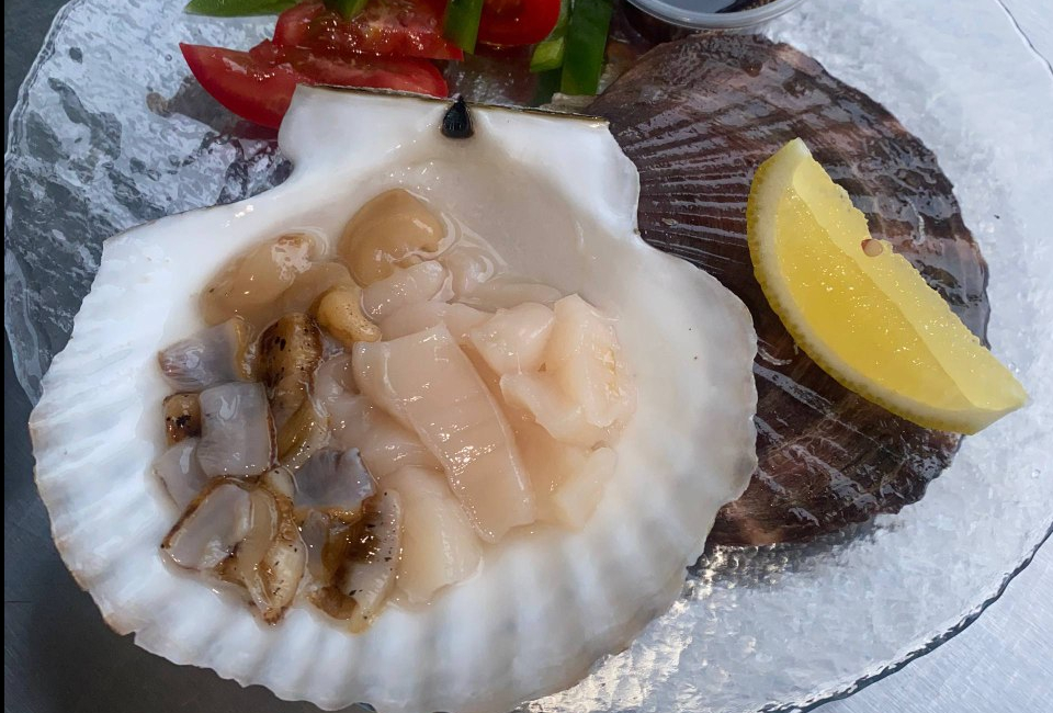 Гребешок живой 200+гр, подается в ракушке с лимоном, соевым соусом и васаби;