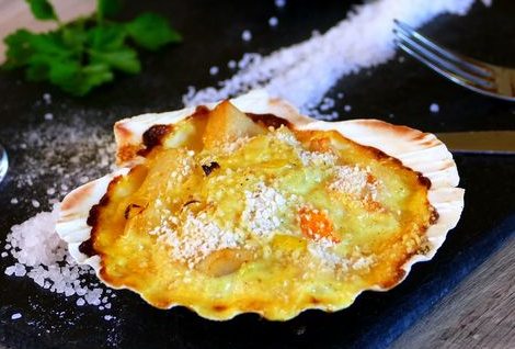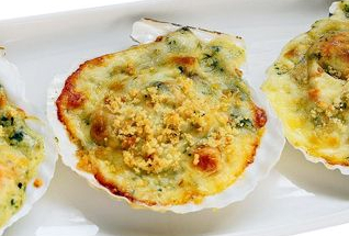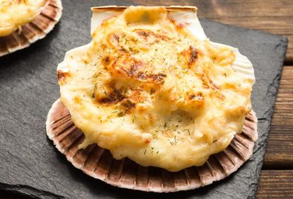 Гребешок 200+гр, запекается на створке с соусом гремолата и сыром сулугуни, подается с хлебцем;