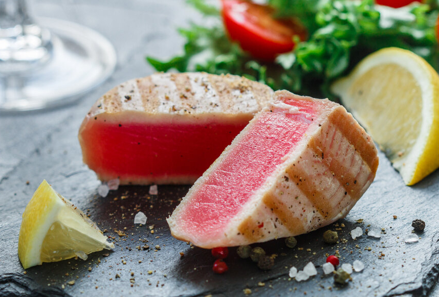 Филе тунца, обжаренное на гриле, подается с микс-салатом, томатами черри, лимоном и ореховым соусом;