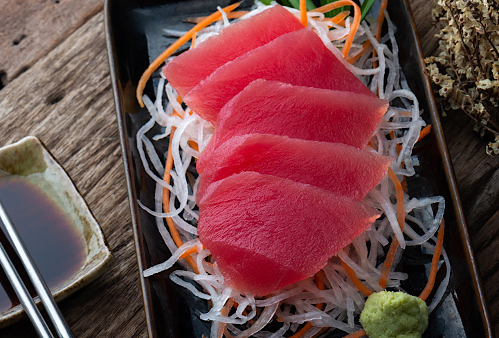 Филе тунца, красный лук и кинза, приправленные китайским соусом, подаются с бородинскими хлебцами и лимоном;