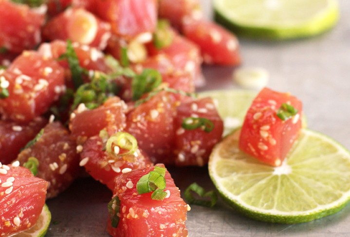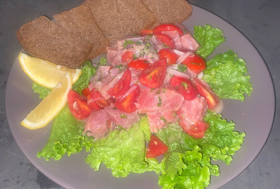 Кусочки тунца, томаты черри, красный лук и кинза, маринованные соком лимона и лайма со специями, подаются с бородинскими хлебцами;