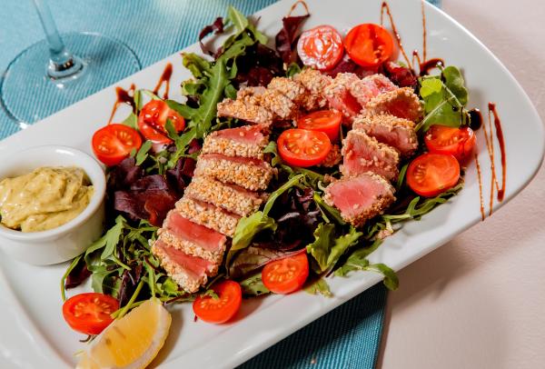 Филе тунца, обжаренное с кунжутом, подается на подушке микс салата, с томатами черри, лимоном и соевым соусом;