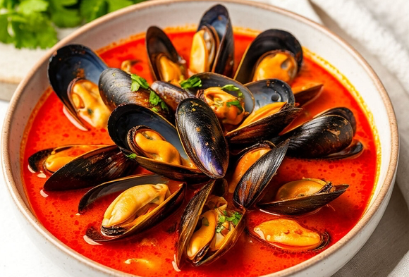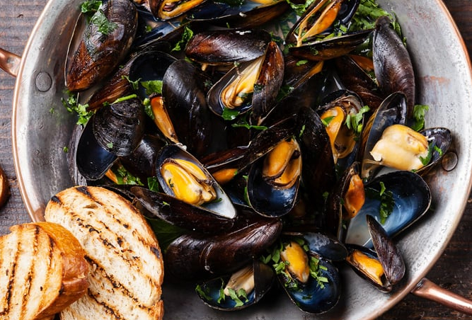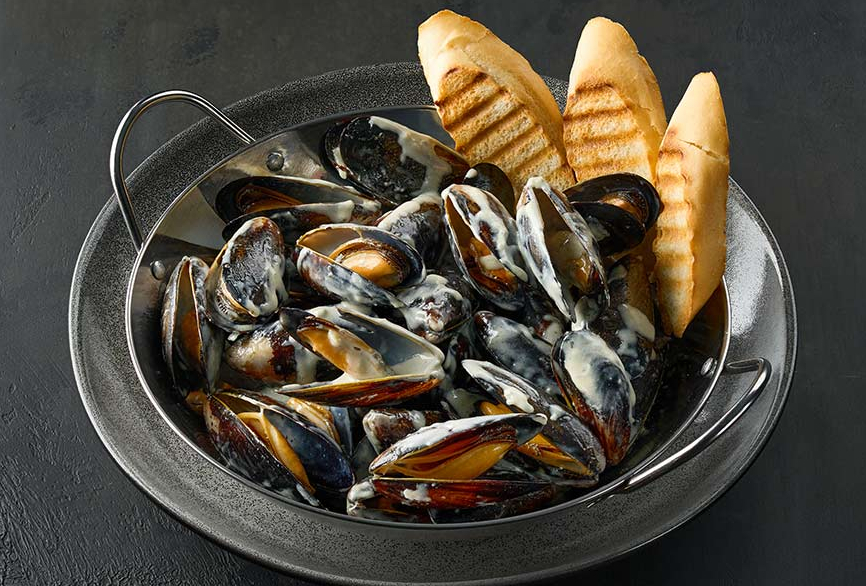 Мидии 400гр, приготовленные с зеленью и сливками, подаются с хлебцами;