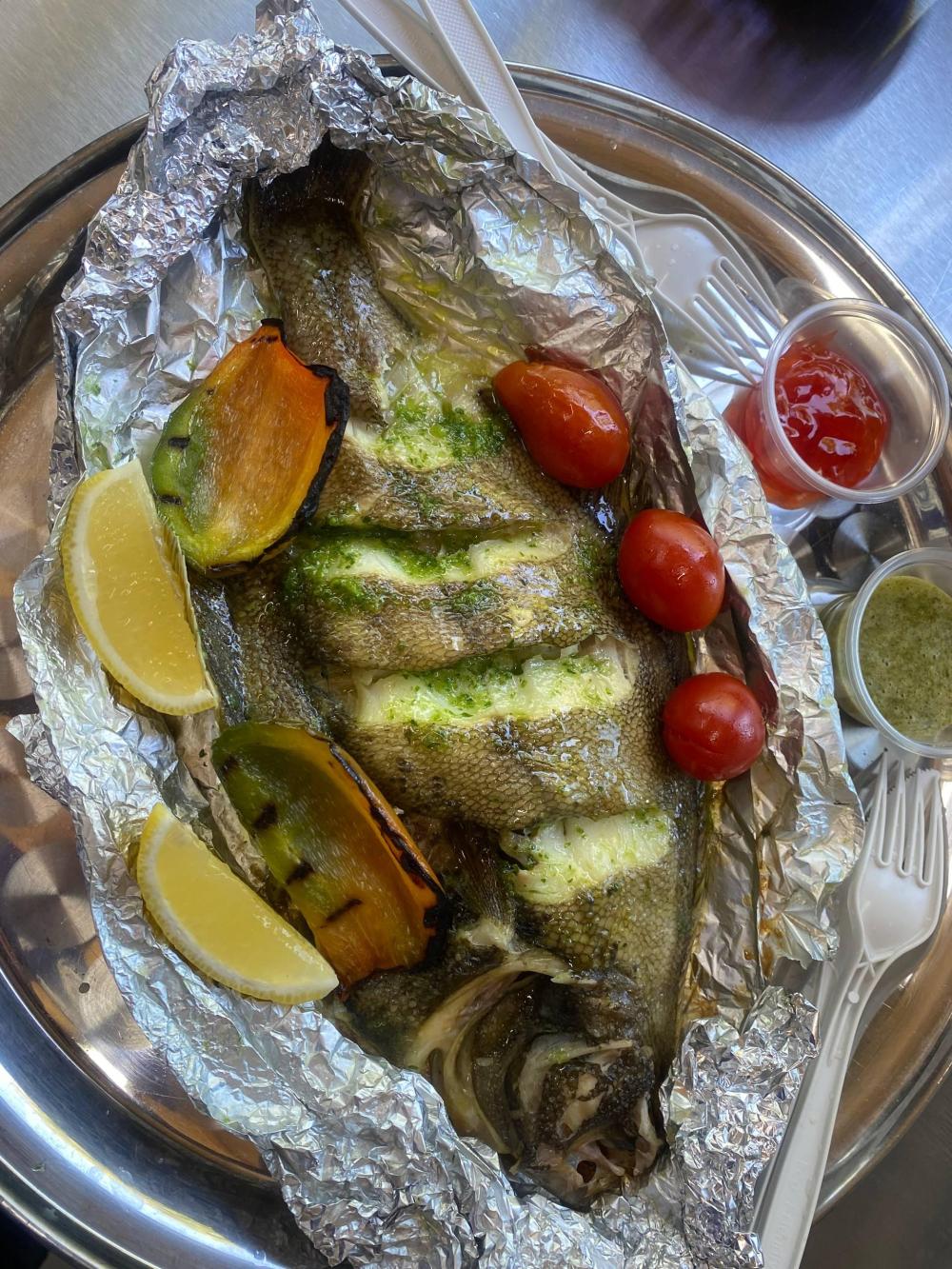 Палтусовая целая камбала, готовим на гриле с листьями лайма, лемонграссом и овощами, подается с лимоном;