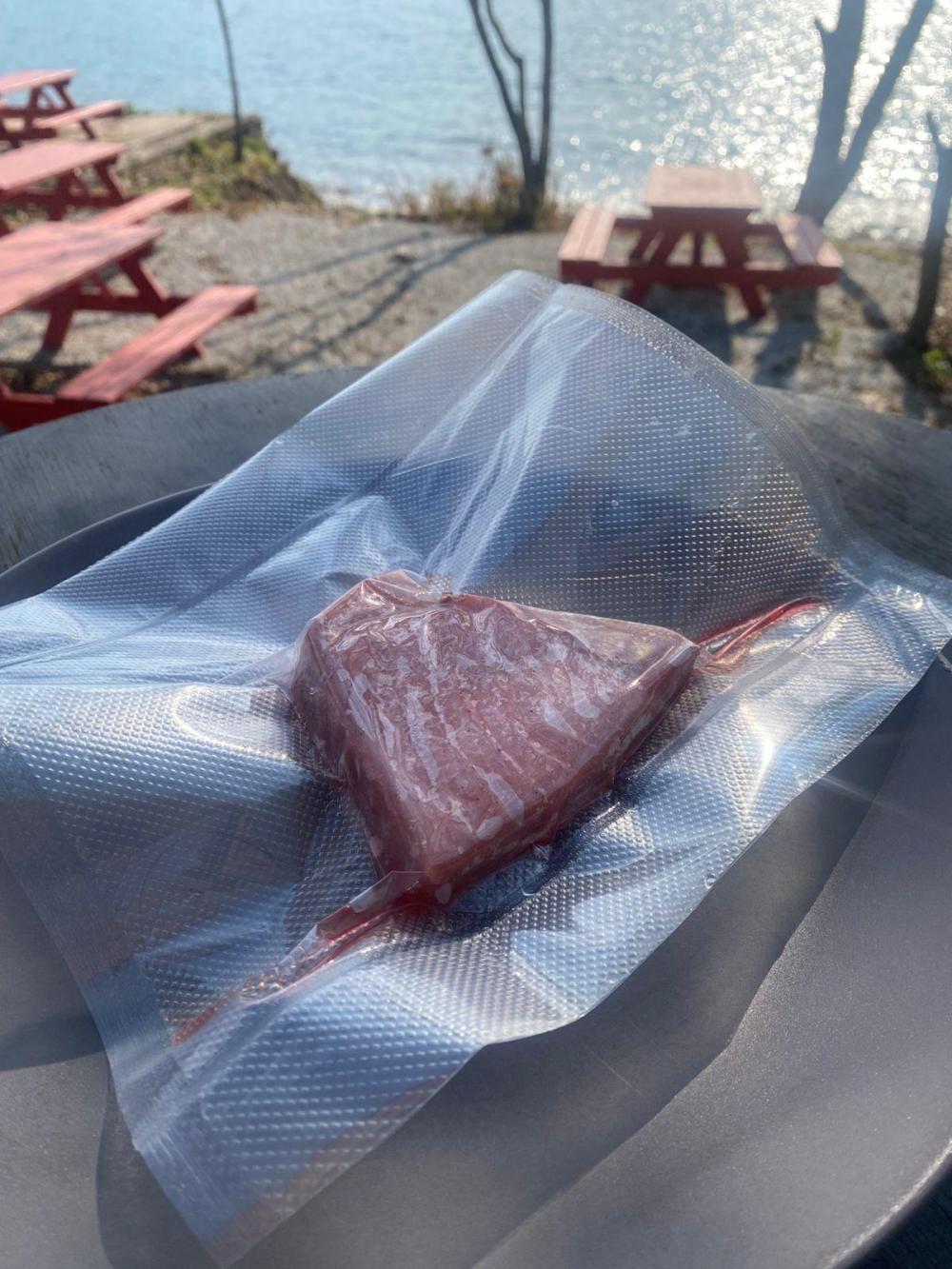 Кусочки тунца, томаты черри, красный лук и кинза, маринованные соком лимона и лайма со специями, подаются с бородинскими хлебцами;